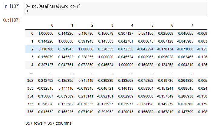 우리가 구한 상관계수를 데이터프레임(DataFrame) 형태로 살펴보면 아까보다 보기 쉽지만 열이름이 단어이름으로 부여되지 않아서 어떤 단어가 상관계수가 높은지 한눈에 알아보기가 힘들다.