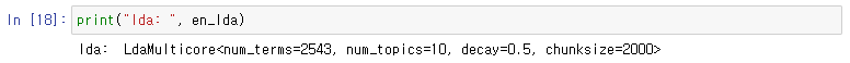 만들어진 BOW인 en_corpus 변수를 사용한다. 여기서 중요한 부분은 num_topics 로 주제를 몇개로 하겠냐는 것이다.